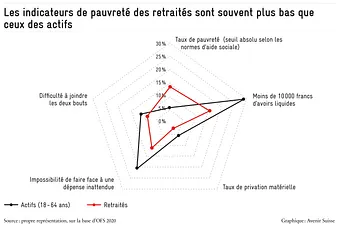 Si le revenu et la fortune déterminent les ressources à disposition, l’analyse des dépenses de consommation permet de mesurer les effets de la pauvreté dans sa finalité. Un indicateur de pauvreté qui capture ces effets est le taux de privation matérielle. Il correspond à l’incapacité d’accéder à certains bien de consommation comme un lave-linge, un repas composé de viande ou de poisson tous les deux jours, ou encore la capacité de partir une semaine en vacances par année. Ce taux est nettement plus élevé chez les actifs (5,6 %) que chez les retraités (2,2 %). D’autres mesures de pauvreté, comme le taux d’impossibilité de faire face à une dépense inattendue ou le pourcentage des ménages n’estimant pas parvenir à joindre les deux bouts sont également plus élevés pour les actifs que pour les retraités (voir graphique).