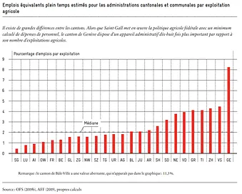 Les grandes différences entre les cantons indiquent un potentiel d’économies. Il convient de vérifier si les cantons de Genève, Valais, Zurich, Tessin, Grisons, Vaud, Neuchâtel, Soleure et Schaffhouse en particulier ont effectivement besoin d’autant de fonctionnaires dans l’agriculture que ceux calculés ici sur la base des frais de personnel. Les processus et les directives internes de l’administration doivent faire l’objet d’un examen critique. En effet, le risque existe que des fonctionnaires supplémentaires viennent s’ajouter à la charge de travail administratif déjà considérable des agriculteurs dans les cantons concernés. Selon la loi de Parkinson, tout travail au sein d’une administration augmente jusqu’à occuper entièrement le temps qui lui est affecté.