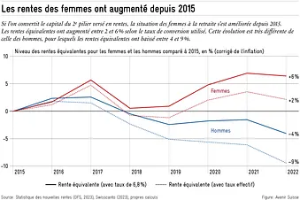 Il faut différencier. Pour les femmes, elles ont augmenté de 2 à 6 % entre 2015 et 2022 si l’on tient compte des versements de capital (voir figure ci-dessous). Cela s’explique en partie par une participation plus forte des femmes sur le marché du travail. Pour les hommes, les prestations ont en effet diminué de 4 à 9 %, selon la méthode de calcul. Une partie de cette baisse s’explique par la réduction des redistributions non conformes au système. Auparavant, les rentes des nouveaux retraités étaient «subventionnées» par les actifs, c’est-à-dire trop élevées. Aujourd’hui, ces financements croisés sont largement réduits. L’équité intergénérationnelle est plutôt respectée.