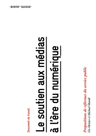En tenant compte du développement technologique, le principe même d’un soutien aux médias pourrait être remis en cause. Le document de travail d’Avenir Suisse part cependant du postulat qu’il existera aussi dans le futur un consensus social et politique pour maintenir un soutien aux médias. Il présente des propositions qui pourraient adapter le système de subventionnement actuel au monde de la convergence des médias. À court terme, des mesures doivent être prises pour réduire les distorsions croissantes de concurrence induites par le financement de la SSR par la redevance.