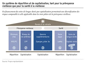 Comme pour la prévoyance vieillesse aujourd’hui, il faudrait opter pour un financement qui repose sur un système de capitalisation. Les coûts des soins aigus (par exemple les traitements en cabinet médical ou à l’hôpital) seraient pris en charge par l’assurance-maladie, comme c’est le cas actuellement. Dans le cadre d’un système de prévoyance vieillesse plus global, il s’agirait du quatrième pilier. Les soins de longue durée, en revanche, seraient couverts par un cinquième pilier, organisé de manière similaire à la prévoyance professionnelle (voir figure). Les individus constitueraient ainsi un capital-soins individuel, transmissible par héritage. Le système de prévoyance suisse se transformerait en un modèle à cinq piliers.
