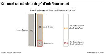 Un degré élevé d’autofinancement indique une plus grande flexibilité financière, une plus grande propension à rembourser un crédit et un risque d’insolvabilité plus faible de l’entreprise. Les valeurs indicatives du degré d’autofinancement en Suisse se situent entre 25 et 50 %. Toutefois, ces valeurs doivent être traitées avec prudence. Elles dépendent du secteur et des réserves accumulées au fil du temps, ainsi que de la politique financière de l’entreprise ; il n’existe pas de chiffres cibles généralement valables indépendamment du secteur pour les ratios de fonds propres et de tiers.[2] En principe, cependant, un risque plus élevé devrait être couvert par un degré d’autofinancement plus important.