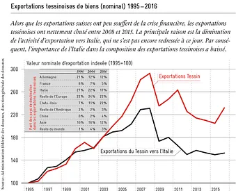 En 2016, le canton du Tessin a exporté pour 6,6 milliards de francs de marchandises à l’étranger. Cela représente un peu moins de 23 % du PIB tessinois, estimé à 28,5 milliards de francs en 2016. Ce chiffre est faible par rapport à celui de la Suisse, dont les exportations de biens constituent 32 % du PIB. Mais, il cache un développement mouvementé.