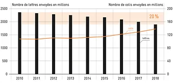 Mais dans quelle mesure les objectifs fixés par le Conseil fédéral sont-ils réalistes ? En principe, la Poste est confrontée à des défis sur plusieurs fronts, ce qui soulève des doutes quant à la réalisation des objectifs. Dans le domaine de l’envoi de lettres, par exemple, la Poste est confrontée à une baisse annuelle des volumes allant jusqu’à 5% en raison de l’utilisation accrue des moyens communications électroniques (e-mail, SMS, chats, services de messagerie instantanée, etc.) (voir figure, échelle de gauche). Depuis 2010 seulement, le volume de lettres en Suisse a déjà chuté de 20% à cause de cette substitution. En outre, le volume de journaux en abonnement et des envois à l’important ne cesse de diminuer. Tout cela a des conséquences négatives sur le chiffre d’affaires de la Poste.