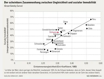 Auf der Horizontalen ist die Verteilung der verfügbaren Haushalteinkommen (nach Steuern) anhand des Gini-Koeffizienten abgetragen. Je höher der Wert, desto ungleicher die Einkommensverteilung im jeweiligen Land. Dass es sich um Werte von 1985 handelt, hat seinen Grund: Krueger wollte zeigen, dass sich die Ungleichheit zu einem bestimmten Zeitpunkt Jahrzehnte später negativ auf die soziale Mobilität auswirke. Wenn dem so wäre, würde das Streben nach Gleichheit der Einkommen zur Grundlage späterer Chancengleichheit und könnte nicht mehr als Ausfluss von Neid diskreditiert werden. Auf der Vertikalen lässt sich ablesen, wie stark das Einkommen eines erwachsenen Sohnes mit dem des Vaters korreliert. Je höher der Wert, desto geringer die soziale Mobilität. Ein Lesebeispiel: 46% für die Schweiz bedeuten, dass ein Sohn, dessen Vater doppelt so viel verdient wie ein anderer Vater derselben Generation, im Durchschnitt 46% mehr verdient als der Sohn des anderen Vaters. Der Wert ist das Mittel der wesentlich höheren sozialen Mobilität unter geborenen Schweizern (38%) und der tieferen Mobilität unter Zugewanderten (55%).