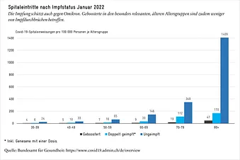 Aus heutiger Sicht lässt sich sagen, dass sich die Impfung für die Gruppe der besonders gefährdeten Personen* auch im Umfeld der Omikron-Variante als besonders nützlich erwiesen hat. So zeigen Zahlen des Bundesamts für Gesundheit (BAG), dass unter den Über-60-Jährigen «geboosterte» und zweifach geimpfte Personen wesentlich weniger Spitaleintritte zu verzeichnen waren als unter den Ungeimpften. Weiter ergaben sich auch deutlich weniger Impfdurchbrüche bei Personen mit Auffrischimpfungen als bei jenen ohne.