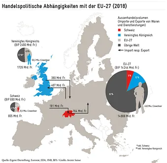 Für EU-Unternehmen ist das Vereinigte Königreich ein mehrfach grösserer Markt als die Schweiz (vgl. Abbildung). Den 66 Millionen Konsumentinnen und Konsumenten auf den Inseln stehen 8,5 Millionen in der Schweiz gegenüber. Dies widerspiegelt sich auch in den Handelsvolumina: Mit dem Vereinigten Königreich handelt die EU-27 mehr als doppelt so viele Güter und Dienstleistungen wie mit der Schweiz. Aufgrund des Brexits rutscht die Schweiz im Ranking der wichtigsten Handelspartner der EU auf den vierten Platz ab, nach den USA, China und dem abtrünnigen Ex-Mitglied.