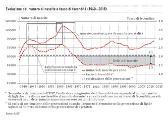 L’evoluzione demografica della società è un processo graduale, e alcuni avvenimenti che risalgono a una o due generazioni fa hanno spesso conseguenze di ampia portata qui e adesso. Uno di questi è il «baby boom» a seguito della ripresa economica dopo la fine della seconda guerra mondiale: a partire dagli anni 1940 la Svizzera ha vissuto un rapido aumento dei tassi di natalità – tasso che ha raggiunto il suo apice nel 1964 (vedi grafico 1). Poi è stata inventata la pillola anticoncezionale e con essa ha avuto inizio il cosiddetto «effetto pillola»: il tasso di natalità è diminuito costantemente, fino a stabilizzarsi a un livello basso a metà degli anni 1970. La Svizzera condivide questo modello demografico con la maggior parte dei paesi del mondo occidentale, con alcune differenze. Così il desiderio di avere figli negli Stati Uniti è iniziato subito dopo la guerra, mentre i paesi gravemente devastati come la Germania sono stati principalmente occupati con la ricostruzione. In Francia invece il calo delle nascite a lungo termine dopo il boom della pillola è stato meno drammatico.