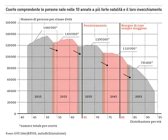 Demografia – cosa ti sta succedendo? Da anni siamo messi in guardia dalle conseguenze del cambiamento demografico: invecchiamento della popolazione, sovraccarico del sistema pensionistico, carenza di manodopera qualificata, calo delle entrate fiscali, rallentamento della dinamica innovativa, atrofizzazione dei fattori di crescita. Di tutto ciò nella vita quotidiana si è però percepito poco; di conseguenza, la preoccupazione per l’invecchiamento della società è rimasta diffusa. In realtà finora ci siamo trovati nella «fase latente» del cambiamento demografico, fase che però sta giungendo al termine. Siamo sulla soglia di una grande ondata di pensionamenti – quelli dei baby boomer.