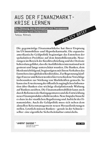 Al fine di limitare gli eccessi e le crisi future, il presente paper avanza diverse proposte, in particolare per irrobustire le forze di mercato. Così un ampliamento dell’accessibilità al pubblico delle informazioni sulle banche può comportare un benefico effetto autodisciplinante. Inoltre, la stabilità dei mercati finanziari può essere migliorata grazie a riforme delle agenzie di rating e allo sviluppo di nuovi prodotti finanziari. Servono nuovi impulsi nella regolamentazione statale e nel controllo dei mercati finanziari. Accanto alla gestione della crisi attuale, la politica monetaria deve accettare nuove sfide e nuovi compiti. In fondo sono proprio le banche –in particolar modo in Svizzera – ad avere il compito di sviluppare una propria cultura della sicurezza.