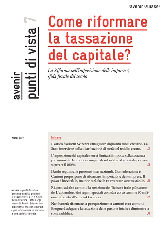 La capacità della Svizzera di attrarre capitale mobile sta alla base di un conflitto fiscale decennale con l’Unione Europea. Nel tentativo di risolvere questo conflitto, Confederazione e Cantoni hanno recentemente proposto una riforma totale dell’imposizione delle imprese che prevede l’abbandono degli statuti fiscali privilegiati di cui godono principalmente le società multinazionali domiciliate in Svizzera. Il primo numero in italiano della collana di Avenir Suisse « avenir punti di vista » decifra gli aspetti più importanti della RII 3, collocandola nel contesto generale dell’imposizione del capitale nel nostro paese.