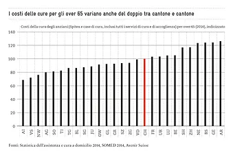 L’organizzazione della cura degli anziani è di competenza dei Cantoni. L’approccio federalista permette di considerare le realtà locali. Tuttavia si osservano differenze significative in termini di costi di cura annuali per gli over 65 e più anziani. Alcuni Cantoni, come Appenzello Interno, Vallese e Nidvaldo forniscono le prestazioni di cura degli anziani spendendo fino al 45 percento in meno rispetto a quelli più dispendiosi (Appenzello Esterno, Ginevra, Basilea) – a un livello di prestazione comparabile (cfr. grafico 3).