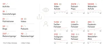 Die Auftritte an Konferenzen und Panels hatten nach den pandemiebedingten Beschränkungen bereits 2021 wieder zugenommen. In Berichtsjahr 2022 stieg die Anzahl Auftritte um knapp ein Zehntel auf 177 weiter an. Ein wachsender Fokus auf elektronische und digitale Medien erlaubte es der Kommunikation, die Inhalte von Avenir Suisse und Avenir Jeunesse vermehrt auf unseren Social-Media-Plattformen zu verbreiten. Dies spiegelt sich in einem deutlichen Anstieg der Video-Aufrufe und Podcast-Plays sowie in steigenden Follower-Zahlen bei Twitter, LinkedIn, Facebook, Instagram sowie auf den diversen Podcast-Kanälen. Wir nahmen durch diesen strategischen Entscheid bewusst einen kleinen Rückgang bei den Webseiten-Aufrufen in Kauf. Gleichzeitig wurden die Webseiten-Inhalte übersichtlicher geordnet und das Design gestrafft, so dass wir mit einem Wiederanstieg der Besucherfrequenz im Jahr 2023 rechnen dürfen.