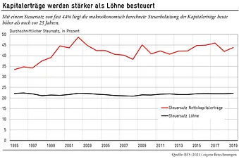 Eine Verschiebung zugunsten des «Kapitals» ist in den letzten Jahrzehnten also nicht zu erkennen. Kapitalsteuern machen heute rund 36% aller Steuereinnahmen des Staates aus; vor 25 Jahren waren es rund 30%. Der Anteil der Lohnsteuern (inkl. Sozialversicherungsabgaben) ist hingegen von 49% auf 44% gefallen. Insgesamt ist die Belastung mit Steuern und Abgaben während dieser Periode leicht angestiegen und erreichte vor der Coronakrise 27,4% des BIP.