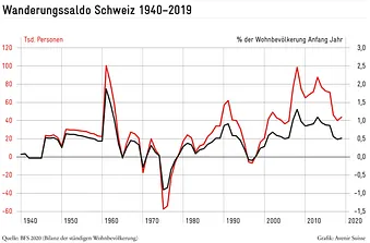 Und so kam es dann auch: Heute leben gut 70’000 Personen weniger in der Schweiz als im 2015er-Referenzszenario vorausgesagt. Das liegt vor allem an der – gegenüber den Rekordjahren um 2010 – deutlich gesunkenen Zuwanderung (vgl. Abbildung 2). 2017, 2018 und 2019 lag der jährliche Wanderungssaldo mit gut 40’000 Personen (was etwa 0,5% der Einwohnerzahl entspricht) deutlich unter den Prognosen von 2015. Entsprechend schlecht lässt sich damit Stimmung gegen die Personenfreizügigkeit machen.