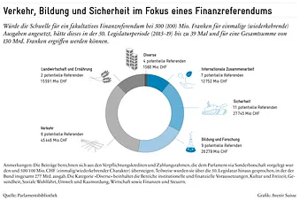 Insgesamt wären aber zahlreiche Aufgabengebiete von der Referendumsfähigkeit einzelner Finanzbeschlüsse betroffen. Während die genannten Geschäfte tendenziell dem Interessensbereich eines bestimmten politischen Lagers zugeordnet werden können, präsentiert sich die Ausgangslage bei Beschlüssen in den Bereichen «Bildung und Forschung» oder «Verkehr» ausgeglichener.