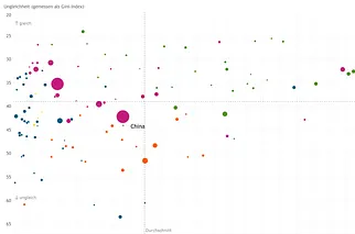 Das Muster in dieser Verteilung spiegelt sich in der Farbe der Linien. Je grösser der Wohlstand (gemessen als Medianeinkommen) in einem Land ist, desto dunkler die Linie. Insgesamt zeigt sich: In der Regel erhalten die unteren Einkommensschichten in den reicheren Ländern einen grösseren Anteil vom gesamten Einkommen als in ärmeren Ländern. Es geht ihnen also nicht nur absolut besser als anderswo, sondern auch im Vergleich mit ihren Mitbürgern.
