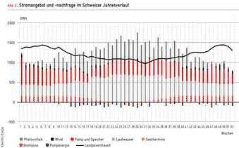 Zusammenfassend lassen sich die Herausforderungen aus den Veränderungen auf der Angebots- und Nachfrageseite einerseits und den spezifischen Charakteristika von Strom andererseits exemplarisch in Abbildung 2 darstellen: Für das Jahr 2015 wurde die Produktion durch die Kernkraftwerke herausgerechnet und die Hälfte der geeigneten Dächer in der Schweiz wurden mit Photovoltaik-Modulen belegt. Damit lässt sich über das ganze Jahr gerechnet die gleiche Menge Strom produzieren wie mit den Kernkraftwerken. Allerdings kommt es zu einer massiven Abweichung zwischen Angebot und Nachfrage. Die Stromproduktion hat ihre Spitze im Sommer (Säulen in der Grafik), während das Maximum des Verbrauchs im Winter anfällt (Kurve). Durch die Elektrifizierung der Wärmebereitstellung für Gebäude nimmt zudem der Strombedarf im Winter massiv zu. Eine teilweise Elektrifizierung der Mobilität hebt die Nachfragekurve über das ganze Jahr nochmals an.