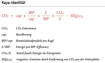 Um die in der Klimapolitik gesteckten Ziele erreichen zu können, braucht es eine darauf abgestimmte Energiepolitik. Die zur Verfügung stehenden Handlungsoptionen lassen sich anhand der leicht modifizierten Kaya-Identität diskutieren (vgl. Kaya-Identität). Um eine klimaneutrale Schweiz (CO2 = 0) zu erreichen, muss einer der vier Faktoren in der Kaya-Identität null werden, oder das verbleibende Produkt wird mit CO2-negativen Technologien (z.B. Carbon capture and storage) kompensiert.