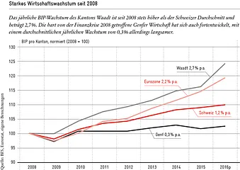 Diese wirtschaftliche Entwicklung wirkte sich auf die regionale Wertschöpfung aus. So wuchs das BIP der beiden Kantone zwischen 2008 und 2016 um 12 Mrd. Fr. und beträgt heute in Genf 48 Mrd. Fr. und in Waadt 56 Mrd. Fr. Die durchschnittliche jährliche Wachstumsrate im Kanton Waadt ist seit 2008 deutlich höher als die Wachstumsrate der Schweiz und der Eurozone (vgl. Abbildung). Die Wachstumsrate des Kantons Genf liegt mit 0,3% pro Jahr im selben Zeitraum deutlich tiefer.