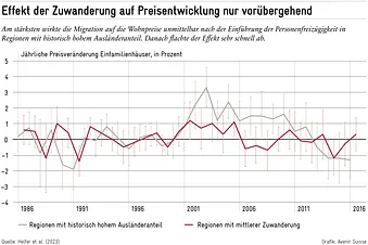 In dieser Untersuchung vergleichen die Autoren die Veränderungen der Immobilienpreise in Regionen mit historisch hohem und niedrigem Anteil an zugezogenen Ausländern aus dem EU-15-Raum vor und nach der Einführung der Personenfreizügigkeit mit der EU (PFZ). Die Grafik fasst die wichtigsten Ergebnisse zusammen. Die graue Linie zeigt die jährlichen Preissteigerungen (in Prozent) für Einfamilienhäuser und Stockwerkeigentum in Gebieten mit dem historisch höchsten Ausländeranteil, vorwiegend in den Schweizer Grossstädten, in der Genferseeregion und im Tessin. Die rote Linie hingegen repräsentiert die entsprechenden Effekte in Regionen mit mittlerer Zuwanderung. Diese Preissteigerungen sind relativ zu den übrigen Regionen gemessen, in denen die Zuwanderung gering war. Den stärksten Einfluss auf die Preise hatte die Migration in Gebieten mit bereits hohem Ausländeranteil, unmittelbar nachdem die PFZ 2002 in Kraft getreten war.