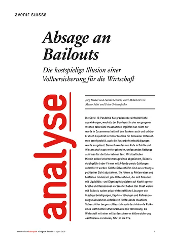 Der Staat würde mit Bailouts zudem privatwirtschaftliche Lösungen wie Gläubigerbeteiligungen, Kapitalerhöhungen und Refinanzierungsmassnahmen unterlaufen. Umfassende staatliche Solvenzhilfen bergen schliesslich auch das inhärente Risiko eines ineffizienten Strukturerhalts: Die Vorstellung, die Wirtschaft mit einer milliardenschweren Vollversicherung «einfrieren» zu können, führt in die Irre.