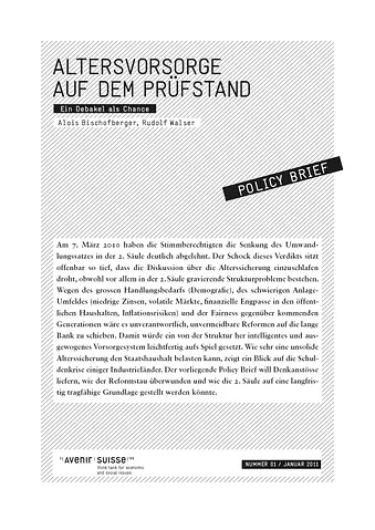 Vor allem in der 2. Säule bestehen gravierende Strukturprobleme. Für deren Beseitigung identifiziert das Policy Paper fünf mögliche Ansatzpunkte: Eine Vereinfachung der Aufsicht, die Beseitigung prozyklischer Anlageanreize, die Etablierung objektiver, politisch unbeeinflussbarer Kriterien für Mindestzins- und Umwandlungssatz, eine höhere Kostentransparenz und ein grösserer Spielraum der Bürger bei der Wahl von Vorsorgeprodukten und -einrichtungen.