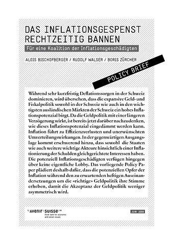 Inflation führt zu Effizienzverlusten und unerwünschten Umverteilungswirkungen. In der gegenwärtigen Ausgangslage kommt erschwerend hinzu, dass sowohl die Staaten wie auch weitere wichtige Akteure hinsichtlich einer Inflationierung der Schulden gleichgerichtete Interessen haben. Hingegen haben die potenziell Inflationsgeschädigten keine eigene Lobby. Das vorliegende Policy Paper plädiert deshalb dafür, dass die potenziellen Opfer der Inflation während den zu erwartenden heftigen Auseinandersetzungen um die «richtige» Geldpolitik ihre Stimme erheben, damit die Akzeptanz der Geldpolitik weniger asymmetrisch wird.