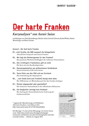 Avenir Suisse stellte sich vor diesem Hintergrund schon zu Beginn des Jahres 2011 die Frage, was für Handlungsmöglichkeiten die Schweiz hat, wenn sich der «Aufwertungsdruck» in einem Ausmass akzentuiert, dass schwere strukturelle Verwerfungen drohen. Gemeint sind damit nicht nur rezessive und deflationäre Tendenzen, wie sie unter anderem etwa zur Rechtfertigung der umstrittenen Interventionen der Schweizerischen Nationalbank zwischen März 2009 und Mai 2010 herhalten mussten, sondern massive Auswirkungen auf die Investitions- und Standortentscheide der Unternehmen.