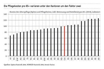 Die Organisation der Alterspflege ist Sache der Kantone. Der föderalistische Ansatz ermöglicht die Berücksichtigung lokaler Gegebenheiten. Jedoch sind erhebliche Unterschiede in Bezug auf die jährlichen Pflegekosten pro 65-Jährigen und Älteren zu beobachten. Die günstigsten Kantone Appenzell Innerrhoden, Wallis und Nidwalden können die Alterspflege bis zu 45 Prozent billiger erbringen als die teuersten (Appenzell Ausserrhoden, Genf, Basel-Stadt) – bei vergleichbarem Versorgungsniveau.