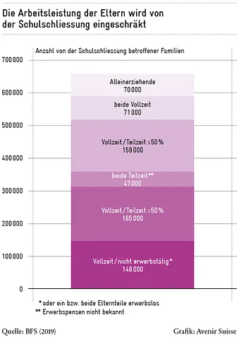 Die 576 000 erwerbstätigen Mütter mit Kindern unter 15 Jahren besetzten hochgerechnet rund 350'000 Vollzeitstellen (wir konzentrieren uns auf die Mütter unter der Annahme, dass die Väter Vollzeit arbeiten). Nehmen wir auf Basis der Sake-Daten zur Branchenzugehörigkeit der erwerbstätigen Mütter an, dass 20% der Mütter in Branchen arbeiten, die aufgrund der Massnahmen ein stark reduziertes Arbeitsvolumen aufweisen (z.B. Gastgewerbe, Unterhaltungsbranche, persönliche Dienstleistungen), und weitere 20% sind im Gesundheits- und Sozialwesen tätig, so dass sie die Betreuung auslagern können (an die Väter, die Gemeinde oder Verwandte/Bekannte). Die restlichen 60% der Mütter (211'000 VZÄ) weisen eine Arbeitsproduktivität von Null auf, weil sie sich um die Betreuung kümmern müssen. Der Wert der verlorenen Arbeitsproduktivität kann anhand des Lohnes (hier Medianlohn von Frauen) quantifiziert werden (211'000 x 6000 Fr. = 1,2 Mr. Fr.). Die Mütter stehen hier stellvertretend für den Elternteil, der die Betreuung übernimmt, in der Realität dürften sich jedoch viele Eltern die Betreuung teilen.