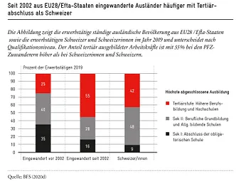 Insgesamt waren 2019 16% aller in der Schweiz Erwerbstätigen mit Sek-I-Abschluss (obligatorische Schule) Ausländerinnen und Ausländer aus EU/Efta-Staa-ten, die seit dem FZA einwanderten. Beim Sek-II-Abschluss machen diese nur gerade 8% aller Erwerbstätigen aus. Schliesslich sind 17% aller Erwerbstätigen mit einem Tertiärabschluss Ausländerinnen und Ausländer aus EU/Efta-Staaten, die seit der Einführung der PFZ einwanderten. Dabei verfügen vor allem jüngere Zuwanderer in der Tendenz über ein höheres Qualifikationsniveau (Bundesrat 2019).
