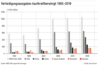Damit geht einher, dass Staaten wie China punkto Innovationskraft, Forschung und Entwicklung (also auch militärisch) aufgeholt haben. Im Vergleich zu 1993 hat Peking seine kaufkraftbereinigten Verteidigungsausgaben um 1249% angehoben, die USA um 118%. Der Rückstand auf die USA ist entsprechend immer kleiner geworden (vgl. Grafik 1). Diese Zahlen decken sich mit der Analyse des Center of Security Studies der ETH, wonach der Vorsprung westlicher militärtechnologischer Überlegenheit vor allem gegenüber China im Schwinden begriffen ist. Anstatt dem abnehmenden Vorsprung durch mehr multilaterale Zusammenarbeit entgegenzuwirken, äussert sich die «America First»-Strategie in Form von bilateralen Deals und einer sukzessiven Entwertung multilateraler Institutionen. Eine Handlungsunfähigkeit dieser Institutionen (Nato, WTO, G-7, G-20) kann mittel- bis längerfristig zu einer so genannten «G-Null-Welt» ohne klare liberale Führung führen.