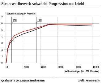 Die Wirkung des Steuerwettbewerbs auf die Progression ist beschränkt. Wären die Vermögen in allen Kantonen gleich verteilt, wäre die Progression nicht viel steiler (rote Linie), als sie heute ist (schwarze Linie). Grosse Städte beispielsweise sind weniger auf tiefe Vermögenssteuern angewiesen.