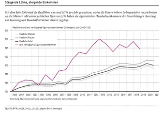 Die sozialpartnerschaftliche Lohnpolitik in der Schweiz ist von Kompromissbereitschaft und einer gewissen Lohnzurückhaltung geprägt. Was für den einzelnen Arbeitnehmenden kurzfristig nachteilig sein kann, hat langfristig positive Folgen für die Beschäftigungsentwicklung und die Krisenresistenz des Arbeitsmarktes. Die Stabilität in der Lohnpolitik zeigt sich auch darin, dass die Nominallöhne nach unten starr sind und in Zeiten von externen Schocks (wie z.B. dem «Frankenschock» 2015) nicht gesenkt werden. Seit Einführung des schweizerischen Lohnindexes im Jahr 1942 sind die Nominallöhne erst einmal (2021: -0,2%) gefallen. Die Arbeitgeber fürchten sich davor, mit sinkenden Nominallöhnen die Arbeitsmoral zu untergraben und gute Arbeitskräfte zu verlieren. So führte die im letzten Jahrzehnt oftmals negative Teuerung (bei moderaten Nominallohnerhöhungen) zu einer spürbaren Erhöhung der Kaufkraft.