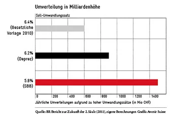 Ein Umwandlungssatz von 6,4% wird jedoch von manchen Experten immer noch als zu hoch empfunden (siehe Deprez: 6,2%, Janssen: <5,0%). Auch haben Pensionskassen, wie die der SBB, bereits heute einen Satz von 5,8% in ihrem Reglement als Zielgrösse definiert. Nimmt man solche Umwandlungssätze als Soll-Grösse an, überschreiten die Quersubventionen schnell 1 Mrd. Fr. jährlich (siehe Abbildung).