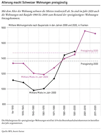 Die gestrichelten Linien entsprechen den Grenzen des preisgünstigen Wohnens in den zwei Referenzjahren, wie sie oben definiert wurden. Im Jahr 2000 lag diese Grenze bei 1365 Fr. pro Monat. Die Durchschnittsmiete von Wohnungen, die vor 1980 gebaut worden waren, lagen damals bereits unter dieser Preisgrenze, nicht jedoch jene, die zwischen 1980 und 2000 erstellt worden waren. Zwanzig Jahre später, im Jahr 2020, war die Mietobergrenze infolge der höheren Haushaltseinkommen auf 1475 Fr. angestiegen. Nun waren auch die Wohnungen mit Baujahr 1980 bis 2000 zum Bestand der «preisgünstigen» Wohnungen hinzugekommen.