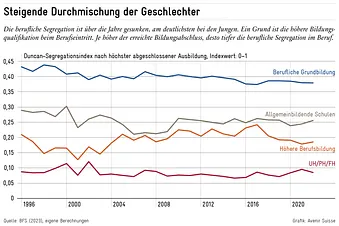 Auch Abschlüsse der höheren Berufsbildung zeigen niedrigere Segregationswerte als jene der Berufslehre – allerdings sind die Unterschiede hier weniger ausgeprägt. Vereinfacht ausgedrückt führen Tertiärabschlüsse zu einer Tätigkeit in weniger segregierten Berufen, während der Abschluss einer Berufslehre häufig in einen Beruf mündet, der als typisch männlich oder weiblich gilt. Diese Tendenzen haben sich in den letzten Jahrzehnten kaum verändert.
