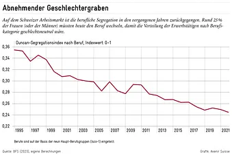 Dies lässt sich etwa anhand des Duncan-Segregationsindexes messen (Abbildung, 1). Dieser Index kann Werte zwischen 0 und 1 annehmen. Ein Wert von 0 bedeutet eine geschlechtsneutrale Verteilung, während 1 eine vollständige Geschlechtertrennung anzeigt. Zwischen 1995 und 2022 sank der Segregationsindex der Berufe in der Schweiz von 0,36 auf 0,25. Das bedeutet, 25 Prozent der Erwerbstätigen müssten den Beruf wechseln, um eine geschlechtsneutrale Verteilung zu erreichen.