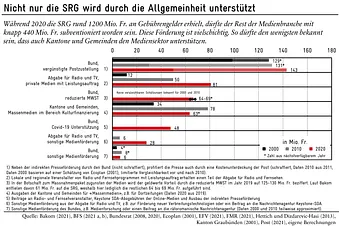 Im Jahr 2020 haben die Subventionen für die Medienbranche ausserhalb der SRG wohl insgesamt knapp 440 Mio. Fr. erreicht. Wird das im Februar zur Abstimmung stehende Massnahmenpaket zugunsten der Medien angenommen, würden alleine aus Bundesmittel über die nächsten sieben Jahre zusätzlich 100 Mio. Fr. jährlich zu den Medien fliessen. Dazu kämen unbefristete Unterstützungsleistungen in der Höhe von maximal 51 Mio. Fr. pro Jahr, finanziert aus den Einnahmen der bestehenden Radio- und Fernsehabgabe. Die Medienbranche ausserhalb der SRG dürfte demnach künftig mit über einer halben Milliarde Franken jährlich subventioniert werden.