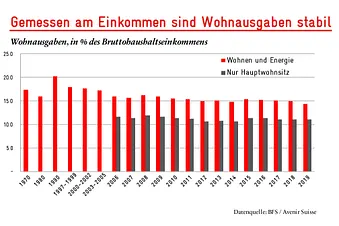 Ein solches Szenario ist in den letzten Jahrzehnten in der Schweiz eingetroffen. Zwar war die Mietpreisteuerung nicht gerade gleich null, aber mit ca. 1 Prozent (real) pro Jahr durchaus moderat. Sie entsprach in etwa dem Anstieg der Löhne und Einkommen, so dass die Schweizer Haushalte heute anteilsmässig nicht mehr fürs Wohnen ausgeben als anno dazumal. Nicht so die Immobilienpreise, die wie bereits erwähnt deutlich stärker zunahmen.