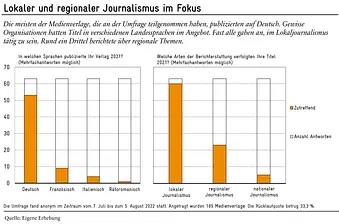 Gut 95% der Umfrageteilnehmer gab an, Lokaljournalismus zu betreiben, also Journalismus auf Ebene der Gemeinde oder des Bezirks. Etwa ein Drittel sah sich im Regionaljournalismus auf Ebene des Kantons oder einer ganzen Region tätig. Lediglich fünf Organisationen erwähnten, auch auf nationaler bzw. überregionaler Ebene aktiv zu sein.