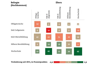 Im Vergleich zu 2011, dem letzten vorherigen Datenpunkt, belegen die dargestellten Zahlen aber zumindest eine gewisse Dynamik, wie die Einfärbung der Vierecke zeigt. Immer weniger Nachkommen von Eltern mit obligatorischer Bildung verbleiben auf diesem Bildungsniveau (–3 Prozentpunkte), dafür stieg der Anteil jener, die aus diesem Elternhaus ein Hochschulstudium absolvieren (+2 Prozentpunkte). Am ausgeprägtesten war die Veränderung indes bei Nachkommen von Eltern mit Hochschulbildung. Durchliefen 2011 noch 56 Prozent der Nachkommen ebenfalls ein Hochschulstudium, waren es 2016 sogar noch 6 Prozentpunkte mehr. Ein Gesamtfazit bleibt schwierig, die Zunahme in der Bildungsmobilität ist nicht überall eindeutig.
