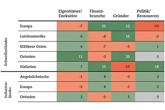 In ihrer Analyse zeigt Freund z.B., dass der Anteil der Milliardäre, die diesen Status durch Erbe erlangt haben, gesunken ist – in den Schwellenländern sehr deutlich von 43 Prozent im Jahr 2001 auf 21 Prozent im Jahr 2014, in den Industrieländern immerhin von 42 Prozent auf 37 Prozent. Geändert hat sich im selben Zeitraum auch das Kräfteverhältnis zwischen Industrie und Schwellenländern: Lebten 2001 in den Schwellenländern mit 102 Milliardären nur gerade ein Fünftel aller Milliardäre, so waren es 2014 mit 705 schon 43 Prozent. Drittens gab es auch Verschiebungen bei den Ursprüngen des grossen Reichtums (siehe Abbildung 1). Unterschieden werden dabei die Kategorien «Eigentümer/Exekutive», «Finanzbranche», «Gründer» und jene, die im Zusammenhang mit natürlichen Ressourcen und Politik zu Reichtum gekommen sind – von den vier Kategorien also sicher die am wenigsten erwünschte. In den angelsächsischen Gebieten und dem reicheren Teil von Europa hat die Finanzbranche etwas mehr Gewicht bekommen (+8 Prozentpunkte bzw. +4 Prozentpunkte), in Ostasien sind es Gründer (+5 Prozentpunkte). In den Schwellenländern sind die Veränderungen zwischen 2001 und 2014 deutlich grösser: Um satte 30 Prozentpunkte etwa hat im weniger entwickelten Teil Europas der Anteil der durch Rohstoffe und Politiknähe reich gewordenen Personen abgenommen – und um fast gleich viel (25 Prozent) in der Finanzbranche zugenommen – eine durchaus erfreuliche Entwicklung, könnte man sagen. Insgesamt zeigt sich aber ein uneinheitliches Bild. In Südasien hat beispielsweise der Anteil von durch Politiknähe Reichgewordenen deutlich zugenommen.