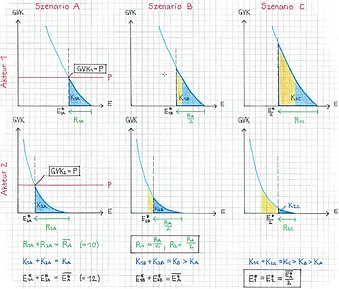 Die Grafik zeigt exemplarisch zwei Akteure mit verschieden hohen CO2-Grenzvermeidungskosten (Akteur 1: hoch; Akteur 2: gering). Sie sind dargestellt als blaue Kurven (GVK), abgetragen auf den CO2-Emissionen (E). Optimieren beide Akteure ihren Ausstoss hinsichtlich eines einheitlichen CO2-Preises (P) (Szenario A), so erzielen sie gemeinsam eine Reduktion der CO2-Emissionen um RA. Wollte man dieselbe Reduktion erzielen, indem man beide Akteure dazu zwingt, ihren Ausstoss um jeweils den gleichen Betrag (RA/2) zu verringern (Szenario B), würde das zu höheren Reduktionskosten (Summe der Flächen K1 und K2) führen. Nochmal deutlich schlechter sieht es aus, wenn man einfach ein einheitliches maximales Emissionsniveau festlegt, das keiner der beiden Akteure überschreiten darf (Szenario C). Umgekehrt gilt (hier nicht dargestellt): Für gegebene Gesamtkosten der Reduktion lässt sich die grösste Reduktion in Szenario A erzielen, eine geringere in Szenario B und eine noch kleinere in Szenario C.